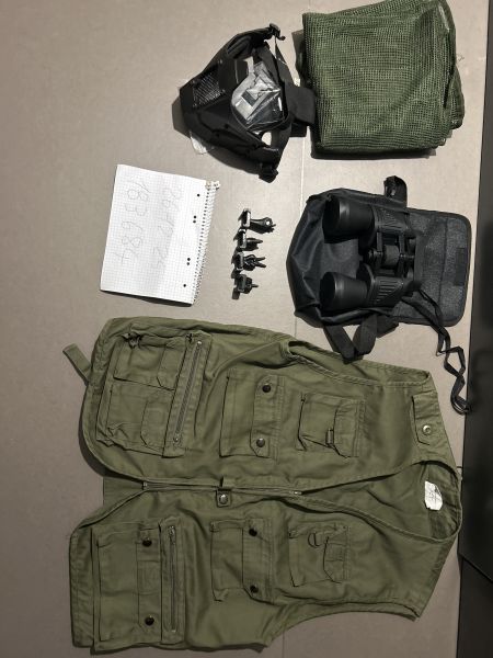Fernglas, Tarnschal, Mundschutz, Weste, Spaß-Kimme und Korn