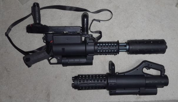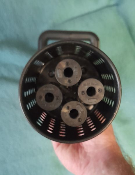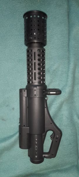 Dazu habe ich für 2 Euro einen metallenen Stiftebecher mit Löchern als Flash Hider drübergestülpt und habe nun eine Full Tracer Minigun in Donnerbüchsen-Optik und geilem metallisch röhrenden Sound!