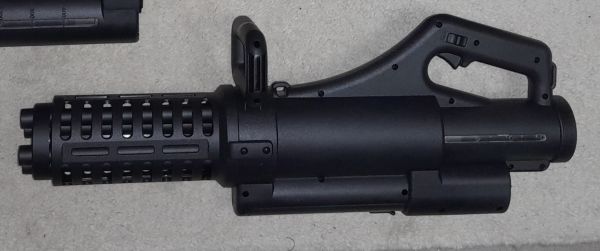 Grifftechnisch wartet die Minigun mit einem Chainsaw Handle auf und einem 45° absteigenden Griff mit Trigger und Sicherung auf.