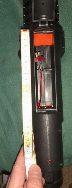 Die Minigun ist eine vollautomatische AEG und wird idealerweise mit einem 11.1 V Lipo Akku betrieben. Das auf der Unterseite befindliche Akkufach hat die Maße von 14x3,5 cm und hat somit Platz für viele gängige Akkus. Anschluss ist ein Deans T-Stecker.