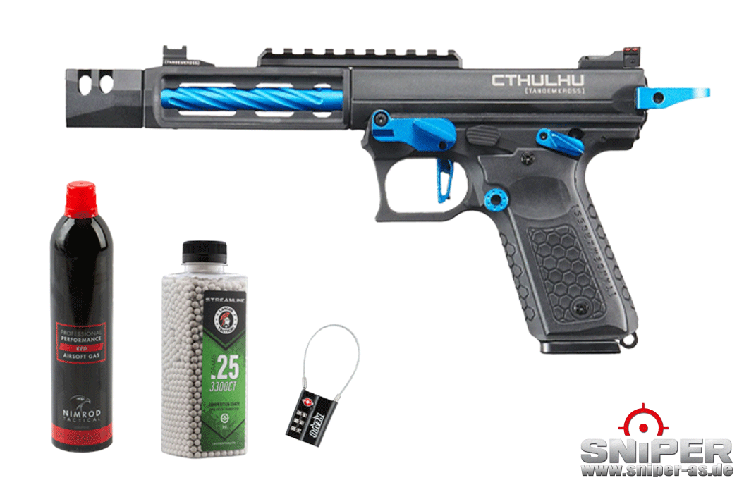 1. Lancer Tandemkross Cthulhu (blau/schwarz) mit allem was du zum Spielen brauchst (Lancer 0,25er BBs, Professional Performance Red Gas und nen Zahlenschloss)