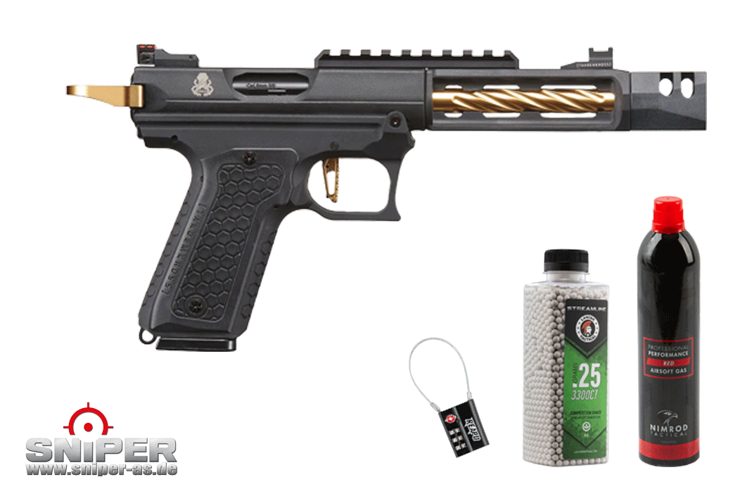 2. Lancer Tandemkross Cthulhu (gold/schwarz) mit allem was du zum Spielen brauchst (Lancer 0,25er BBs, Professional Performance Red Gas und nen Zahlenschloss)
