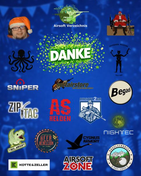 Riesen Dank, an alle die das wieder möglich gemacht haben - unsere Preise kommen in diesem Jahr von: Sniper-AS, Kotte-Zeller, AirsoftZone, Begadi, Kugelschubser, Softairstore, Waffen Pfitzner, Nighttec, Airsofthelden, BeerRebellion, Airsoft2Go, ZipTac, Cygnus Armory und Polymetis Systems. Viele davon unterstutzen uns seit Jahren, oft schon so lange wie es die Verlosung gibt - euer Engagement für die Szene ist einfach grandios 🥳